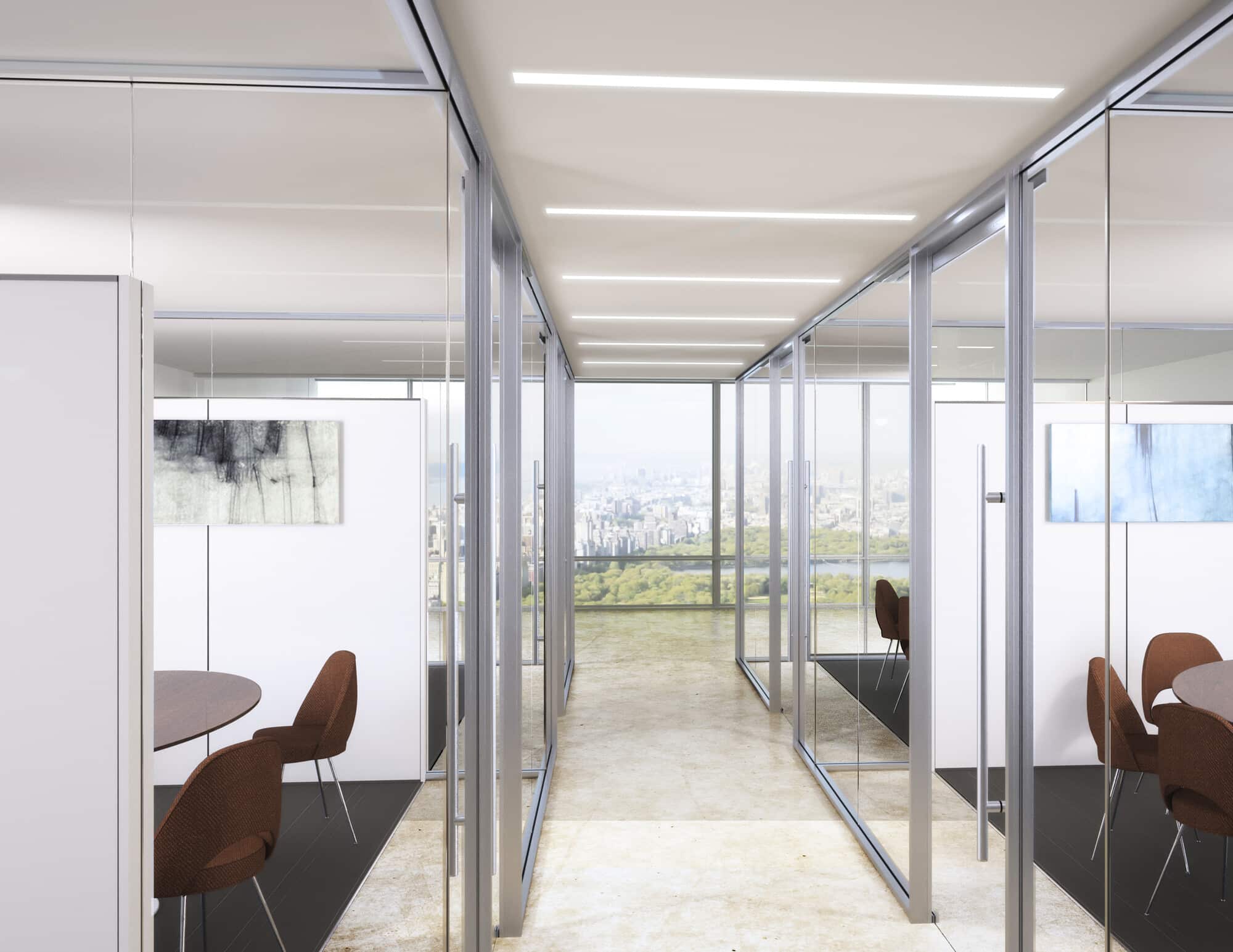 The ONE interior glass wall system features simple, clean lines and stunning clarity, allowing natural daylight to reach every area of your workspace.